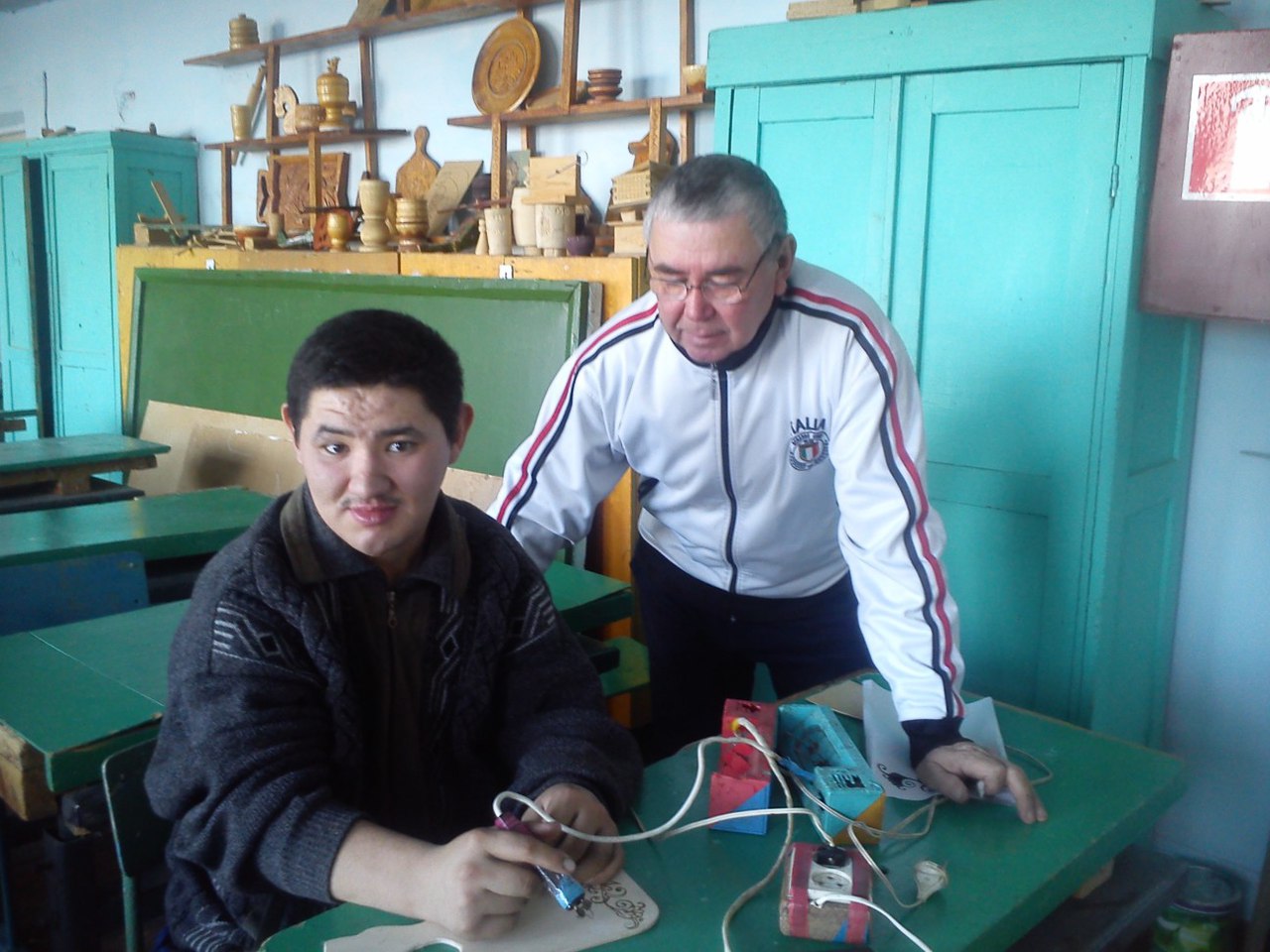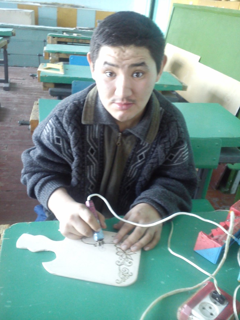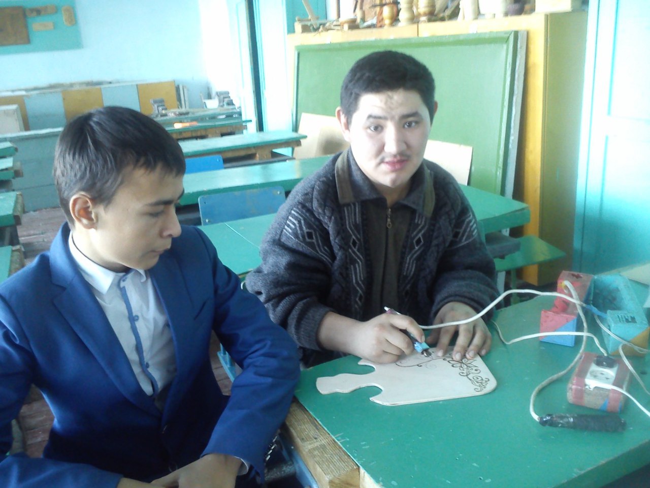 В школу был приглашен Галиакберов Гайса. Он занимался в этот день в ркужке технического творчества выжиганием.